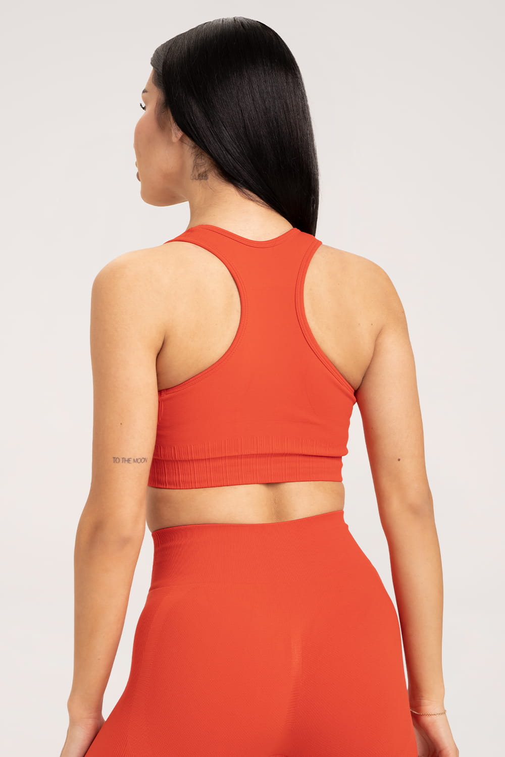 - Sutien sport fără cusături, cu decolteu înalt, confortabil, cu cupe complete.