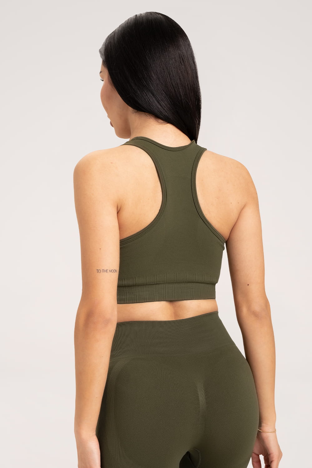 - Sutien sport fără cusături, cu decolteu înalt, confortabil, cu cupe complete.