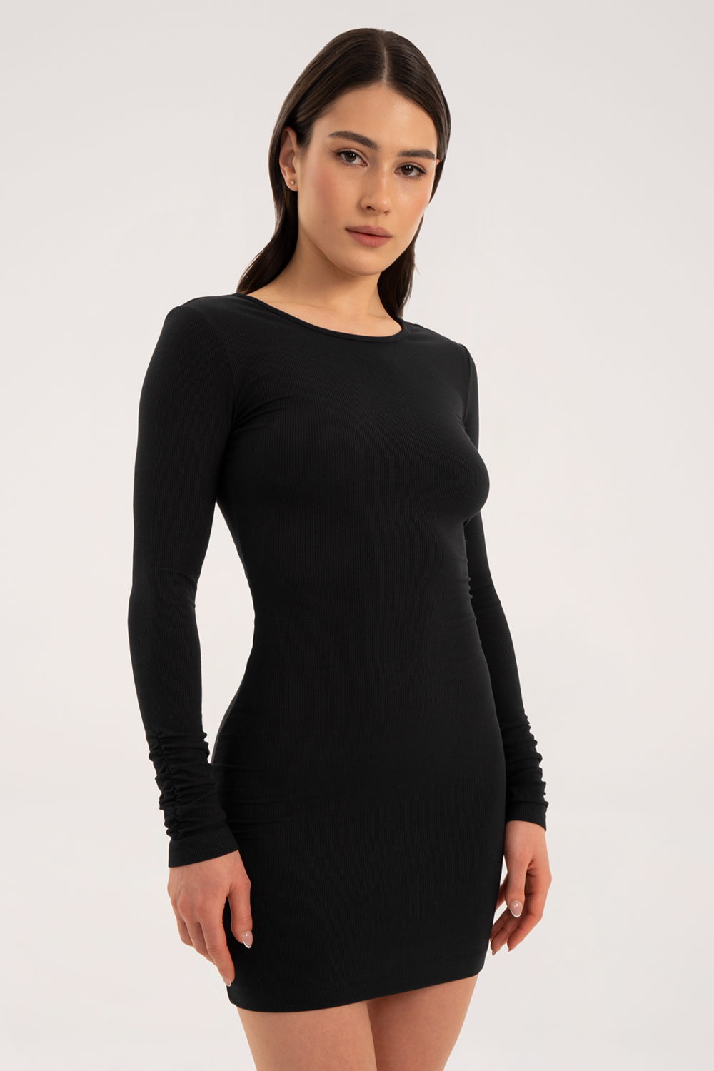 - Mânecile lungi cu încrețituri adiționale și despicătura de efect de pe spate, în forma literei “V”, îi conferă siluetei eleganță și lejeritate, iar încrețiturile aplicate pe partea din spate scot în evidență extrem de bine silueta și fesele.